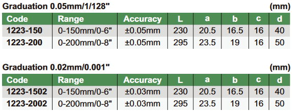 Diapazons: 0-150 mm/0-6". Mērījumi (precizitāte): 0.05 mm/1/128". Atbilst DIN862.