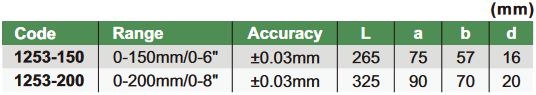 Mērījumi (gradācija) 0.02mm/0.001”. Precizitāte +-0.03mm. Karbīda uzgalis . Izgatavots no nerūsējošā tērauda (izņemot pamatni). Skala ar satīna hroma apdari.