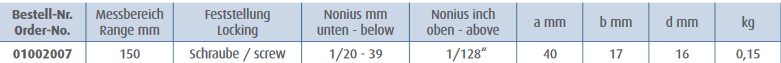 Hromēts, rūdīts; Četrvirzienu mērījumi; Skalas garums 150mm. Iedaļas vērtība 1/20 jeb 0,05mm.