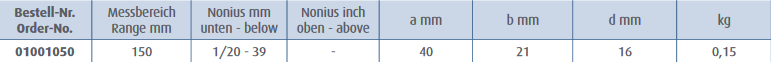 Izgatavots no nerūsējošā tērauda; Ar uzstādītu skrūvi; Hromēts, rūdīts; Četrvirzienu mērījumi; DIN 862; Ar futrāli. Bez paralaksa, mm nolasījums. Skalas garums 150mm. Iedaļas vērtība 1/20 jeb 0,05mm.
