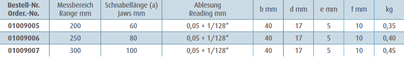 MIB Messzeuge Bīdmērs 250 mm, žokļi 80mm, ied.vērt. 1/20 (0,05mm), viegla svara versija, 01009006