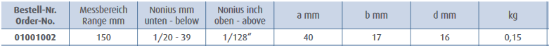 Izgatavots no nerūsējošā tērauda; Hromēts, rūdīts; Četrvirzienu mērījumi; DIN 862; Ar futrāli. Skalas garums 200mm. Iedaļas vērtība 1/20 jeb 0,05mm.