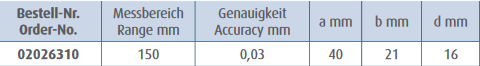 IP 67 aizsardzība, ūdens un putekļu necaurlaidīgs; Izgatavots no nerūsējošā tērauda, rūdīts; Četrvirzienu mērījumi; 0,01mm nolasījums; DIN 862; Induktīvā mērīšanas sistēma; 3V. Ar futrāli. Skalas garums 150mm. Precizitāte 0,03mm.