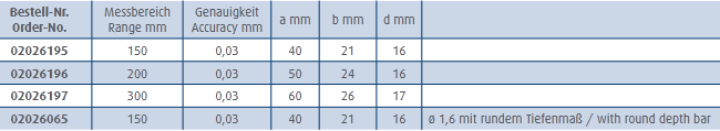 Skala ar stikla sliedi precīzai paraugu ņemšanai; Izgatavots no nerūsējošā tērauda, rūdīts; 0,01mm nolasījums; Četrvirzienu mērījumi; Izmantojams ar vai bez rullīti; DIN 862; Ar futrāli. Diapazons 150mm. Precizitāte 0,03mm.
