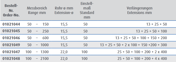 Karbīda mērīšanas virsmas; Rādījums 0,01 mm; Ar iestatīšanas standartu; Precizitāte ± (3 + n + L/50) μm, n = paplašinājuma numurs, L = maks. garuma mērīšana; Kastē.