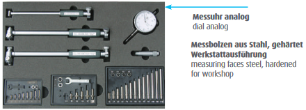 Iekšmēru komplekts, ar satīna hroma apdari; Ar indikatoru, nolasījums 0,01 mm; Atkārtota precizitāte 0,005 mm; Ideāli piemērots komplekts darbnīcām; Kastē.