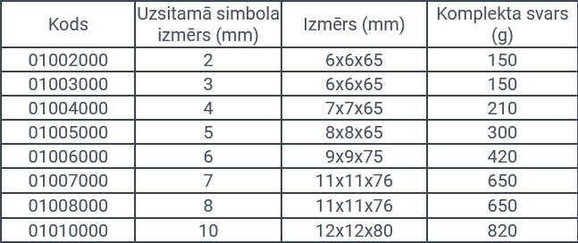 • Katrs uzsitējs marķēts ar: uzsitamā simbola izmēru (mm), Made in Germany un starptautiskā acu aizsardzība simbols